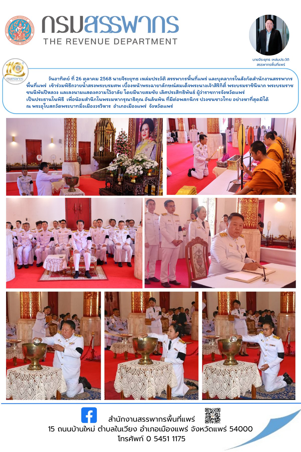 วันอาทิตย์ ที่ 26 ตุลาคม 2568 นายจีระยุทธ เหล่มประวัติ สรรพากรพื้นที่แพร่ และบุคลากรในสังกัดสำนักงานสรรพากรพื้นที่แพร่ เข้าร่วมพิธีถวายน้ำสรงพระบรมศพ เบื้องหน้าพระฉายาลักษณ์สมเด็จพระนางเจ้าสิริกิติ์ พระบรมราชินีนาถ พระบรมราชชนนีพันปีหลวง และลงนามแสดงความไว้อาลัย โดยมีนายสมชัย เลิศประสิทธิพันธ์ ผู้ว่าราชการจังหวัดแพร่ เป็นประธานในพิธี เพื่อน้อมสำนึกในพระมหากรุณาธิคุณ อันล้นพ้น ที่มีต่อพสกนิกร ปวงชนชาวไทย อย่างหาที่สุดมิได้ ณ พระอุโบสถวัดพระบาทมิ่งเมืองวรวิหาร อำเภอเมืองแพร่ จังหวัดแพร่