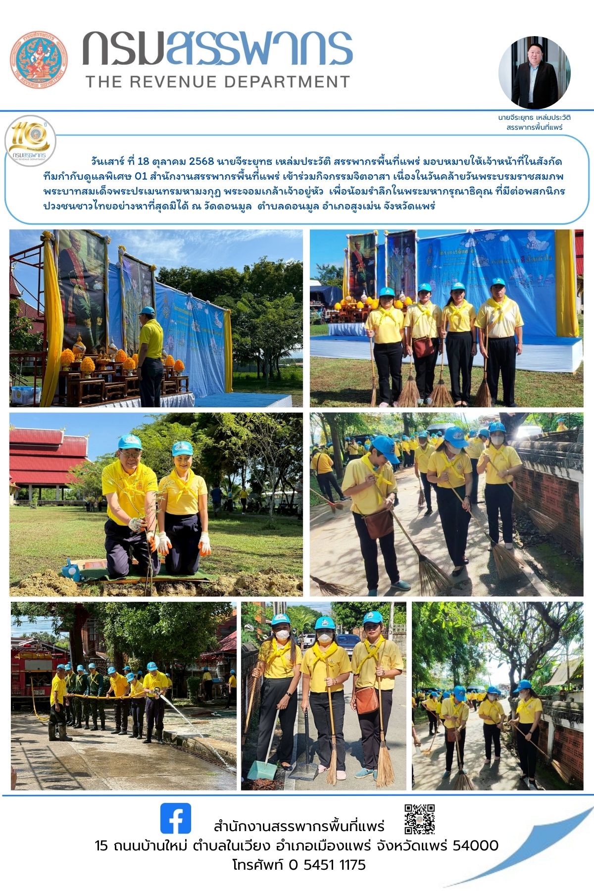 วันเสาร์ ที่ 18 ตุลาคม 2568 นายจีระยุทธ เหล่มประวัติ สรรพากรพื้นที่แพร่ มอบหมายให้เจ้าหน้าที่ในสังกัด ทีมกำกับดูแลพิเศษ 01 สำนักงานสรรพากรพื้นที่แพร่ เข้าร่วมกิจกรรมจิตอาสา เนื่องในวันคล้ายวันพระบรมราชสมภพ พระบาทสมเด็จพระปรเมนทรมหามงกุฏ พระจอมเกล้าเจ้าอยู่หัว เพื่อน้อมรำลึกในพระมหากรุณาธิคุณ ที่มีต่อพสกนิกร ปวงชนชาวไทยอย่างหาที่สุดมิได้ ณ วัดดอนมูล ตำบลดอนมูล อำเภอสูงเม่น จังหวัดแพร่