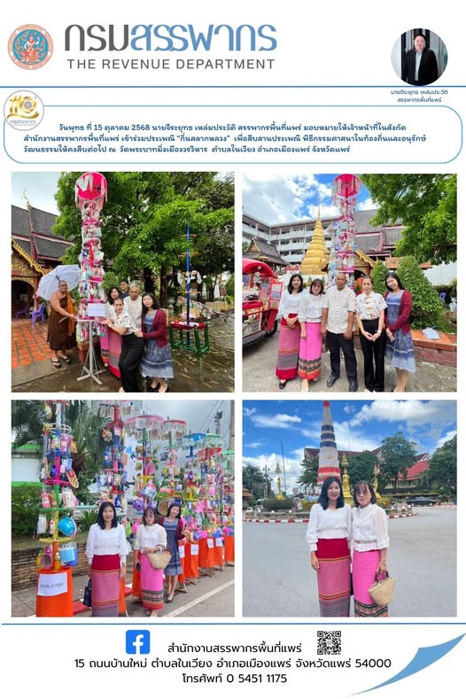 วันพุทธ ที่ 15 ตุลาคม 2568 นายจีระยุทธ เหล่มประวัติ สรรพากรพื้นที่แพร่ มอบหมายให้เจ้าหน้าที่ในสังกัด สำนักงานสรรพากรพื้นที่แพร่ เข้าร่วมประเพณี “กิ๋นสลากหลวง” เพื่อสืบสานประเพณี พิธีกรรมศาสนาในท้องถิ่นและอนุรักษ์วัฒนธรรมให้คงสืบต่อไป ณ วัดพระบาทมิ่งเมืองวรวิหาร ตำบลในเวียง อำเภอเมืองแพร่ จังหวัดแพร่