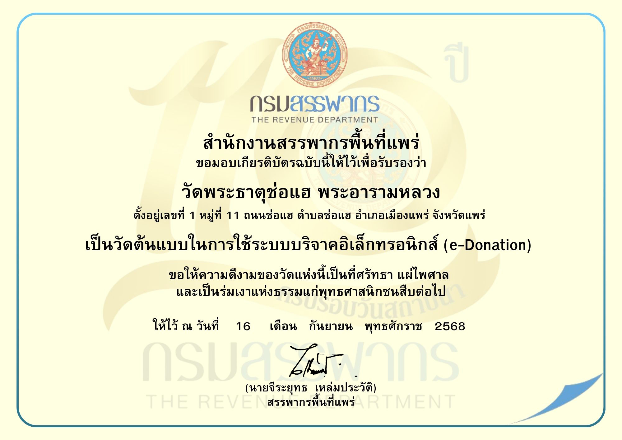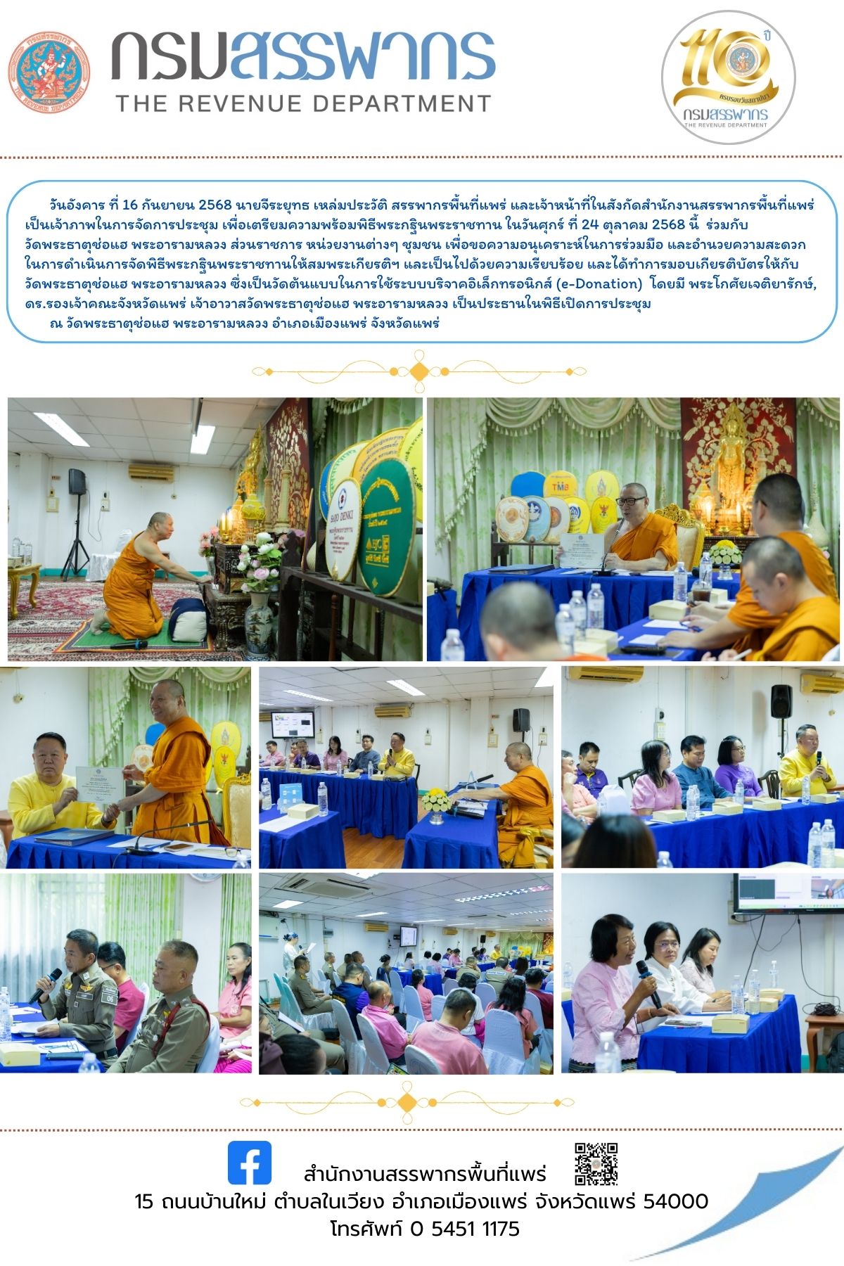 วันอังคาร ที่ 16 กันยายน 2568 นายจีระยุทธ เหล่มประวัติ สรรพากรพื้นที่แพร่ และเจ้าหน้าที่ในสังกัดสำนักงานสรรพากรพื้นที่แพร่ เป็นเจ้าภาพในการจัดการประชุม เพื่อเตรียมความพร้อมพิธีพระกฐินพระราชทาน ในวันศุกร์ ที่ 24 ตุลาคม 2568 นี้ ร่วมกับวัดพระธาตุช่อแฮ พระอารามหลวง ส่วนราชการ หน่วยงานต่างๆ ชุมชน เพื่อขอความอนุเคราะห์ในการร่วมมือ และอำนวยความสะดวก ในการดำเนินการจัดพิธีพระกฐินพระราชทานให้สมพระเกียรติฯ และเป็นไปด้วยความเรียบร้อย และได้ทำการมอบเกียรติบัตรให้กับวัดพระธาตุช่อแฮ พระอารามหลวง ซึ่งเป็นวัดต้นแบบในการใช้ระบบบริจาคอิเล็กทรอนิกส์ (e-Donation) โดยมี พระโกศัยเจติยารักษ์,ดร.รองเจ้าคณะจังหวัดแพร่ เจ้าอาวาสวัดพระธาตุช่อแฮ พระอารามหลวง เป็นประธานในพิธีเปิดการประชุม ณ วัดพระธาตุช่อแฮ พระอารามหลวง อำเภอเมืองแพร่ จังหวัดแพร่