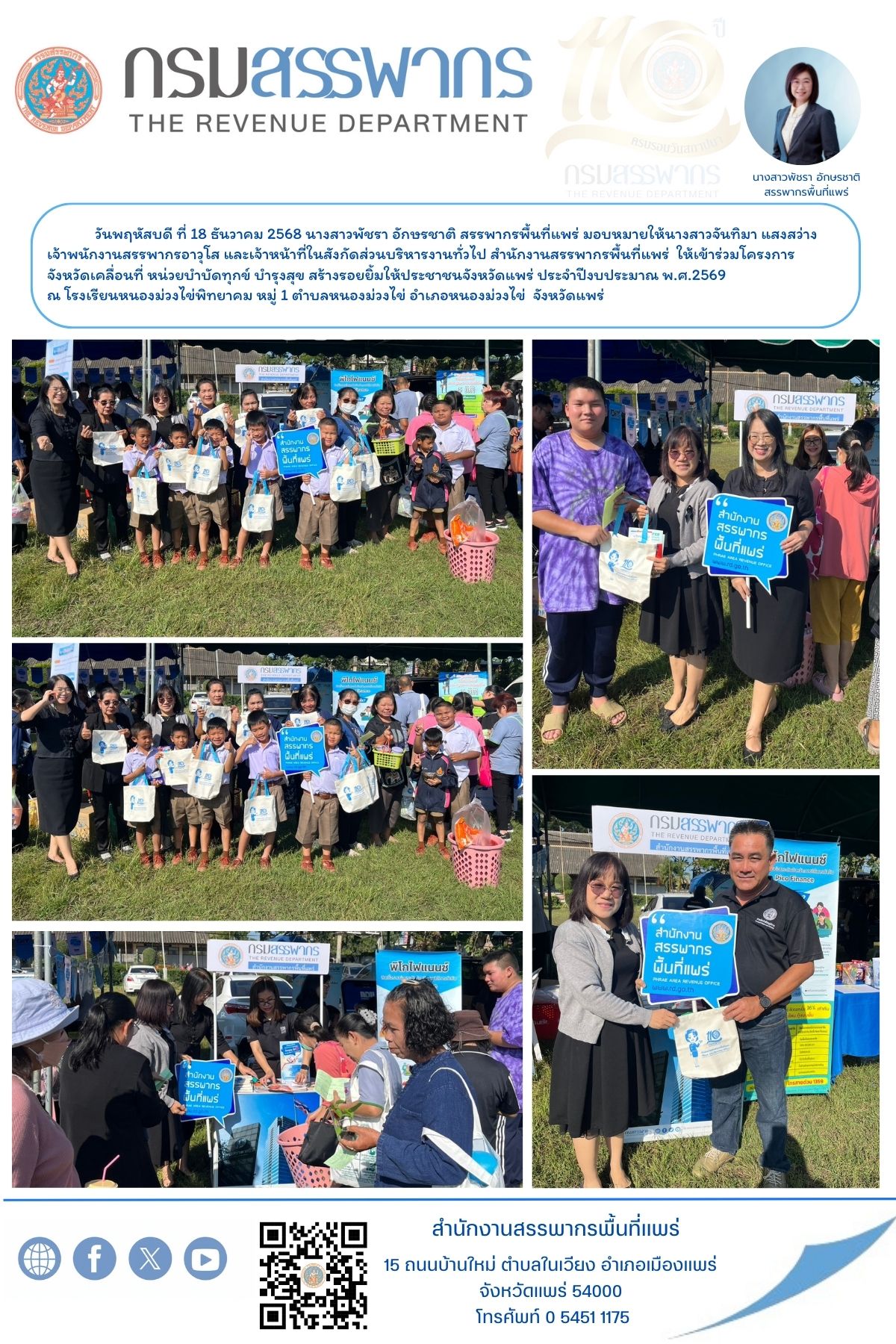 วันพฤหัสบดี ที่ 18 ธันวาคม 2568 นางสาวพัชรา อักษรชาติ สรรพากรพื้นที่แพร่ มอบหมายให้นางสาวจันทิมา แสงสว่าง เจ้าพนักงานสรรพากรอาวุโส และเจ้าหน้าที่ในสังกัดส่วนบริหารงานทั่วไป สำนักงานสรรพากรพื้นที่แพร่ ให้เข้าร่วมโครงการจังหวัดเคลื่อนที่ หน่วยบำบัดทุกข์ บำรุงสุข สร้างรอยยิ้มให้ประชาชนจังหวัดแพร่ ประจำปีงบประมาณ พ.ศ.2569 ณ โรงเรียนหนองม่วงไข่พิทยาคม หมู่ 1 ตำบลหนองม่วงไข่ อำเภอหนองม่วงไข่ จังหวัดแพร่