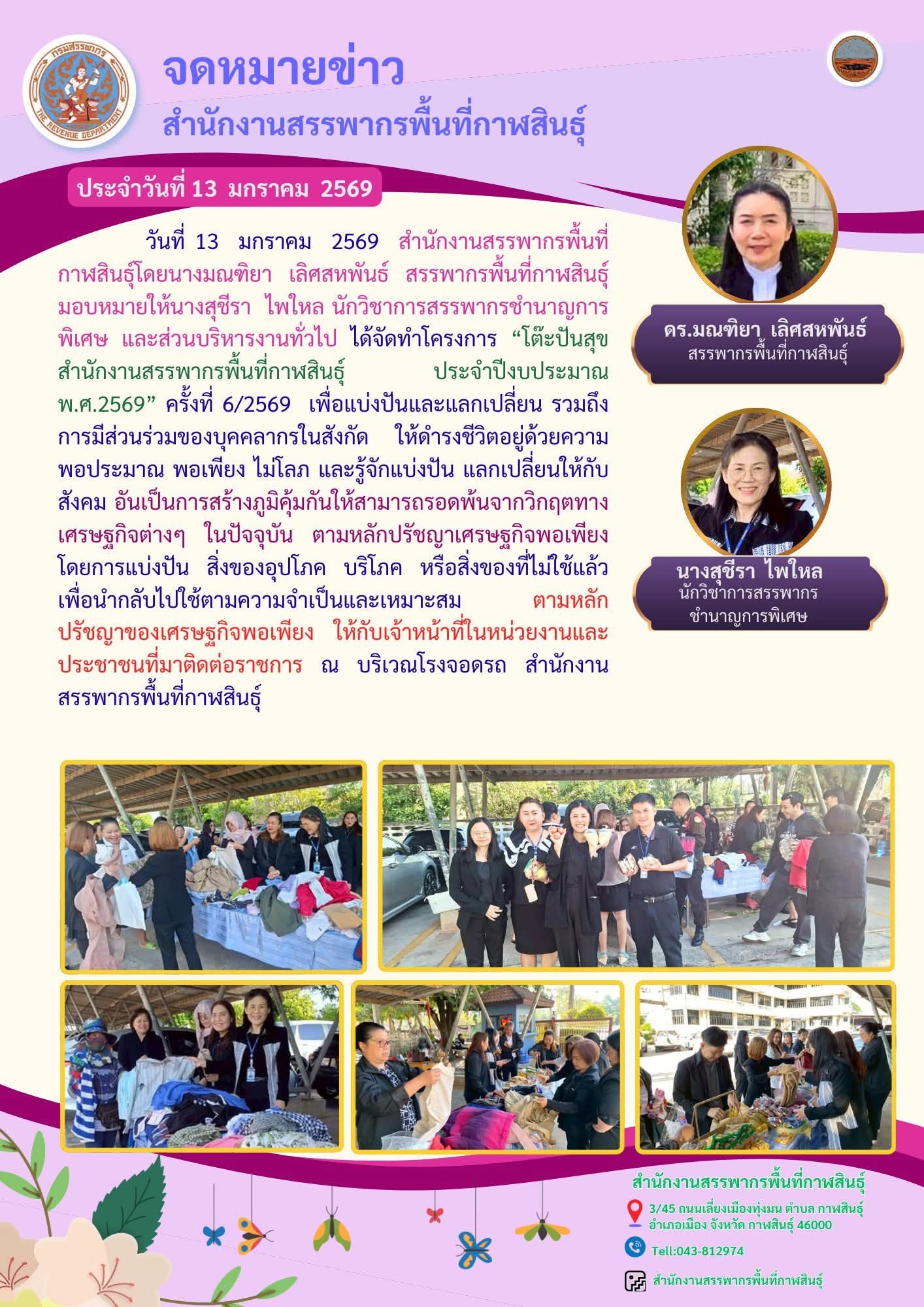สำนักงานสรรพากรพื้นที่กาฬสินธุ์โดยนางมณฑิยา เลิศสหพันธ์ สรรพากรพื้นที่กาฬสินธุ์ มอบหมายให้นางสุชีรา ไพใหล นักวิชาการสรรพากรชำนาญการพิเศษ และส่วนบริหารงานทั่วไป ได้จัดทำโครงการ “โต๊ะปันสุข สำนักงานสรรพากรพื้นที่กาฬสินธุ์ ประจำปีงบประมาณ พ.ศ.2569” ครั้งที่ 6/2569 เพื่อแบ่งปันและแลกเปลี่ยน รวมถึงการมีส่วนร่วมของบุคคลากรในสังกัด ให้ดำรงชีวิตอยู่ด้วยความพอประมาณ พอเพียง ไม่โลภ และรู้จักแบ่งปัน แลกเปลี่ยนให้กับสังคม อันเป็นการสร้างภูมิคุ้มกันให้สามารถรอดพ้นจากวิกฤตทางเศรษฐกิจต่างๆ ในปัจจุบัน ตามหลักปรัชญาเศรษฐกิจพอเพียง โดยการแบ่งปัน สิ่งของอุปโภค บริโภค หรือสิ่งของที่ไม่ใช้แล้ว เพื่อนำกลับไปใช้ตามความจำเป็นและเหมาะสม ตามหลักปรัชญาของเศรษฐกิจพอเพียง ให้กับเจ้าหน้าที่ในหน่วยงานและประชาชนที่มาติดต่อราชการ ณ บริเวณโรงจอดรถ สำนักงานสรรพากรพื้นที่กาฬสินธุ์