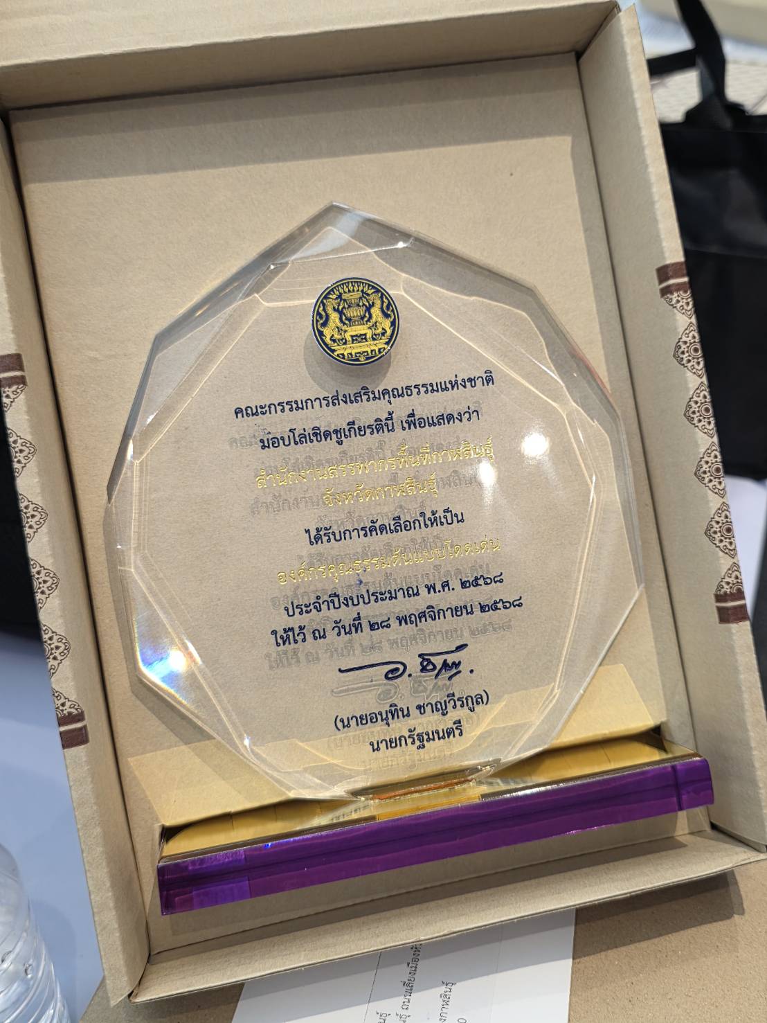สำนักงานสรรพากรพื้นที่กาฬสินธุ์โ ดย นางมณฑิยา เลิศสหพันธ์ สรรพากรพื้นที่กาฬสินธุ์ เข้ารับโล่เชิดชูเกียรติ องค์กร คุณธรรมต้นแบบโดดเด่น ประจำปีงบประมาณ พ.ศ. 2569 เพื่อเป็นการสร้างขวัญกำลังใจ และเสริมแรงจูงใจในการส่งเสริมการขับเคลื่อนองค์กรคุณธรรม ซึ่งเป็นส่วนหนึ่งของเป้าหมายในการสร้าง “สังคมไทยเป็นสังคมคุณธรรม ที่มีความมั่นคง มั่งคั่ง และยั่งยืน” โดยมีนายบวรศักดิ์ อุวรรณโน รองนายกรัฐมนตรีเป็นประธานในการมอบ ณ ห้องนิทรรศการ 5 ชั้น 1 อาคารหอศิลป์แห่งชาติ กระทรวงวัฒนธรรม ถนนเทียนร่วมมิตร เขตห้วยขวาง กรุงเทพมหานคร