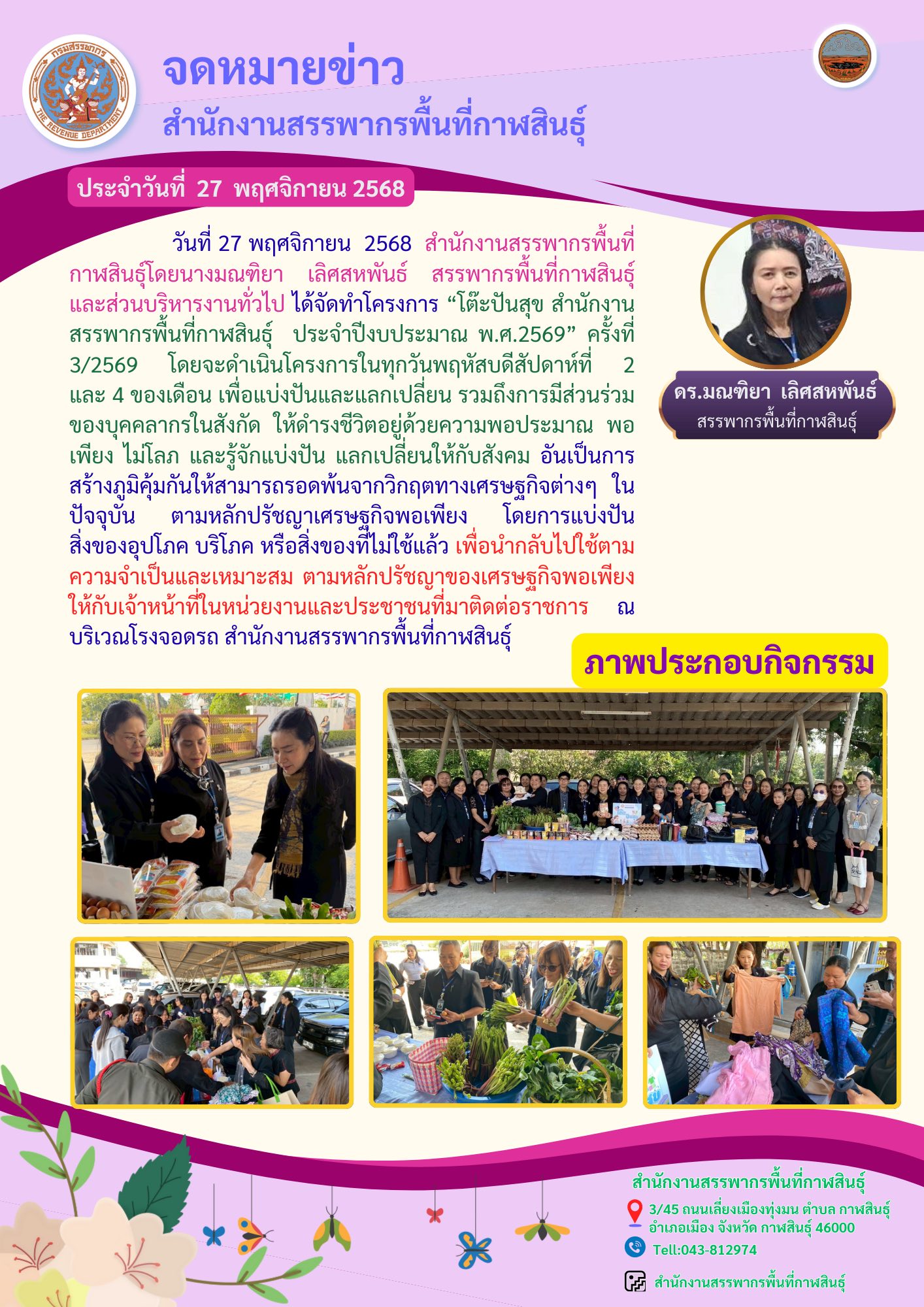 สำนักงานสรรพากรพื้นที่กาฬสินธุ์โดยนางมณฑิยา เลิศสหพันธ์ สรรพากรพื้นที่กาฬสินธุ์ และส่วนบริหารงานทั่วไป ได้จัดทำโครงการ “โต๊ะปันสุข สำนักงานสรรพากรพื้นที่กาฬสินธุ์ ประจำปีงบประมาณ พ.ศ.2569” ครั้งที่ 3/2569 โดยจะดำเนินโครงการในทุกวันพฤหัสบดีสัปดาห์ที่ 2 และ 4 ของเดือน เพื่อแบ่งปันและแลกเปลี่ยน รวมถึงการมีส่วนร่วมของบุคคลากรในสังกัด ให้ดำรงชีวิตอยู่ด้วยความพอประมาณ พอเพียง ไม่โลภ และรู้จักแบ่งปัน แลกเปลี่ยนให้กับสังคม อันเป็นการสร้างภูมิคุ้มกันให้สามารถรอดพ้นจากวิกฤตทางเศรษฐกิจต่างๆ ในปัจจุบัน ตามหลักปรัชญาเศรษฐกิจพอเพียง โดยการแบ่งปัน สิ่งของอุปโภค บริโภค หรือสิ่งของที่ไม่ใช้แล้ว เพื่อนำกลับไปใช้ตามความจำเป็นและเหมาะสม ตามหลักปรัชญาของเศรษฐกิจพอเพียง ให้กับเจ้าหน้าที่ในหน่วยงานและประชาชนที่มาติดต่อราชการ ณ บริเวณโรงจอดรถ สำนักงานสรรพากรพื้นที่กาฬสินธุ์