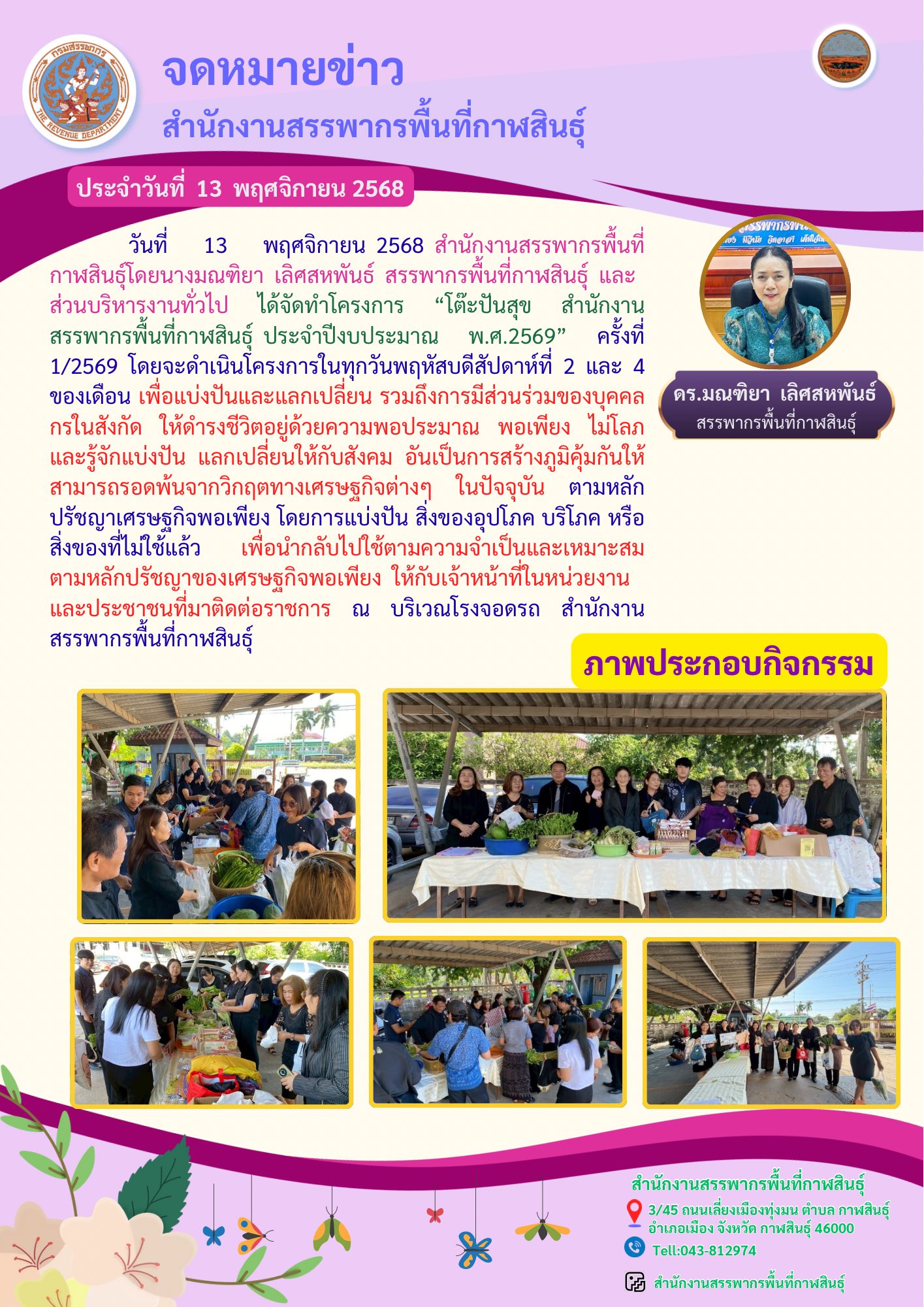 สำนักงานสรรพากรพื้นที่กาฬสินธุ์โดยนางมณฑิยา เลิศสหพันธ์ สรรพากรพื้นที่กาฬสินธุ์ และส่วนบริหารงานทั่วไป ได้จัดทำโครงการ “โต๊ะปันสุข สำนักงานสรรพากรพื้นที่กาฬสินธุ์ ประจำปีงบประมาณ พ.ศ.2569” ครั้งที่ 1/2569 โดยจะดำเนินโครงการในทุกวันพฤหัสบดีสัปดาห์ที่ 2 และ 4 ของเดือน เพื่อแบ่งปันและแลกเปลี่ยน รวมถึงการมีส่วนร่วมของบุคคลกรในสังกัด ให้ดำรงชีวิตอยู่ด้วยความพอประมาณ พอเพียง ไม่โลภ และรู้จักแบ่งปัน แลกเปลี่ยนให้กับสังคม อันเป็นการสร้างภูมิคุ้มกันให้สามารถรอดพ้นจากวิกฤตทางเศรษฐกิจต่างๆ ในปัจจุบัน ตามหลักปรัชญาเศรษฐกิจพอเพียง โดยการแบ่งปัน สิ่งของอุปโภค บริโภค หรือสิ่งของที่ไม่ใช้แล้ว เพื่อนำกลับไปใช้ตามความจำเป็นและเหมาะสม ตามหลักปรัชญาของเศรษฐกิจพอเพียง ให้กับเจ้าหน้าที่ในหน่วยงานและประชาชนที่มาติดต่อราชการ ณ บริเวณโรงจอดรถ สำนักงานสรรพากรพื้นที่กาฬสินธุ์