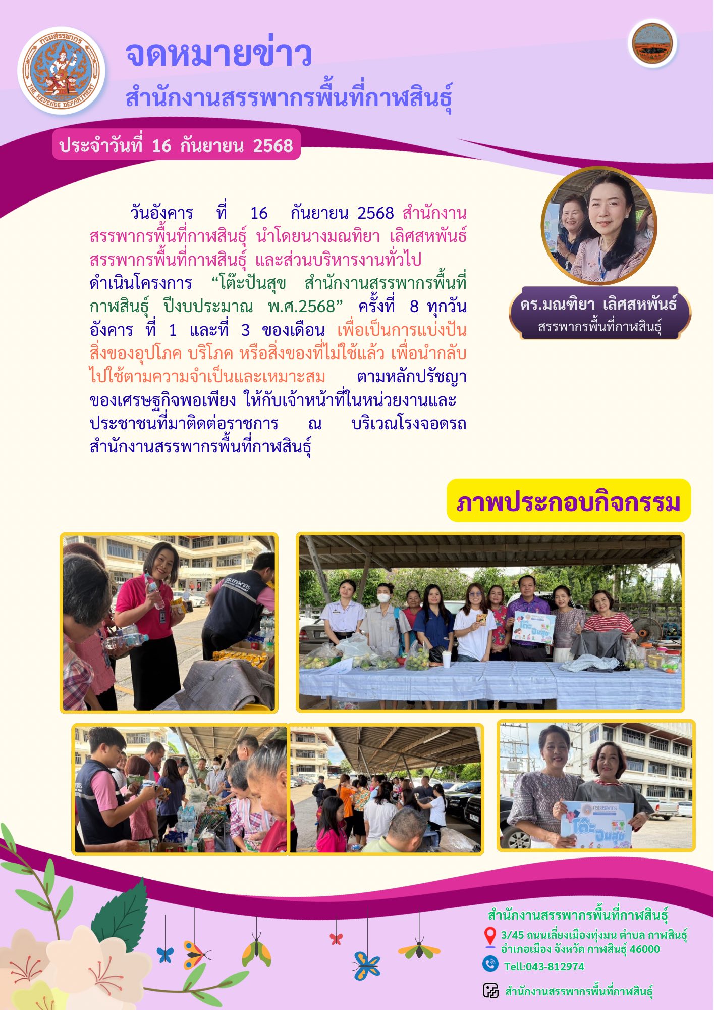 สำนักงานสรรพากรพื้นที่กาฬสินธุ์ นำโดยนางมณทิยา เลิศสหพันธ์ สรรพากรพื้นที่กาฬสินธุ์ และส่วนบริหารงานทั่วไป ดำเนินโครงการ “โต๊ะปันสุข สำนักงานสรรพากรพื้นที่กาฬสินธุ์ ปีงบประมาณ พ.ศ.2568” ครั้งที่ 8 ทุกวันอังคาร ที่ 1 และที่ 3 ของเดือน เพื่อเป็นการแบ่งปัน สิ่งของอุปโภค บริโภค หรือสิ่งของที่ไม่ใช้แล้ว เพื่อนำกลับไปใช้ตามความจำเป็นและเหมาะสม ตามหลักปรัชญาของเศรษฐกิจพอเพียง ให้กับเจ้าหน้าที่ในหน่วยงานและประชาชนที่มาติดต่อราชการ ณ บริเวณโรงจอดรถ สำนักงานสรรพากรพื้นที่กาฬสินธุ์ #โต๊ะปันสุข #สำนักงานสรรพากรพื้นที่กาฬสินธุ์