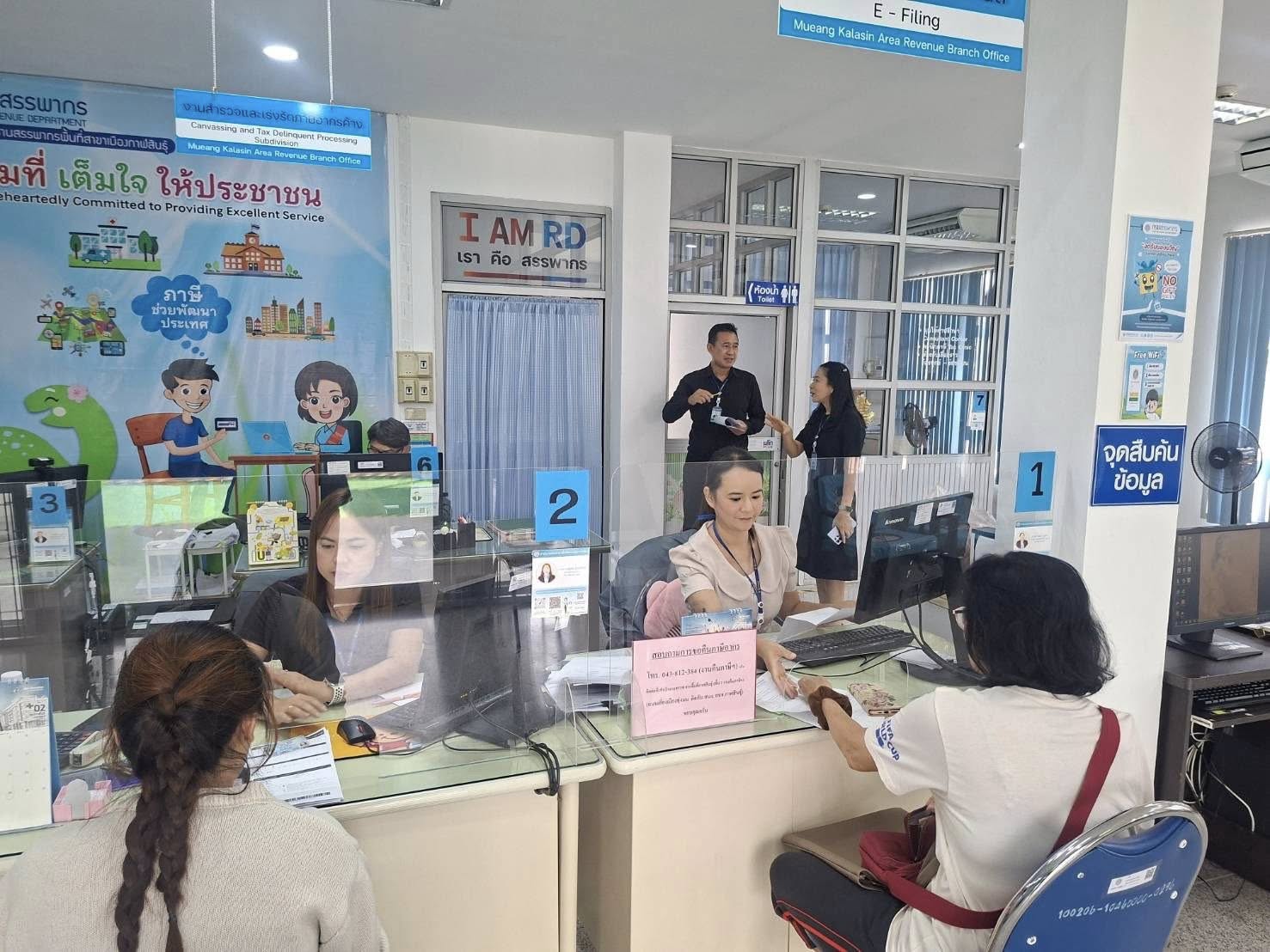 สำนักงานสรรพากรพื้นที่กาฬสินธุ์โดยนางมณฑิยา เลิศสหพันธ์ สรรพากรพื้นที่กาฬสินธุ์ และนายชายชาญ ชุมทอง นักวิชาการภาษีชำนาญการพิเศษพร้อมด้วยข้าราชการสังกัดส่วนวางแผนและประเมินผล เข้าตรวจเยี่ยมสำนักงานสรรพากรพื้นที่สาขากุฉินารายณ์ สำนักงานสรรพากรพื้นที่สาขาเขาวง สำนักงานสรรพากรพื้นที่สาขาคำม่วง สำนักงานสรรพากรพื้นที่สาขาสหัสขันธ์ สำนักงานสรรพากรพื้นที่สาขาเมืองกาฬสินธุ์และสำนักงานสรรพากรพื้นที่สาขากมลาไสย เพื่อสร้างขวัญ กำลังใจในการปฏิบัติงานของข้าราชการและเจ้าหน้าที่ และรับฟังปัญหา อุปสรรค ตลอดจนชี้แนะแนวทางในการให้บริการประชาชน ในช่วงระยะเวลาการยื่นแบบแสดงรายการภาษีเงินได้บุคคลธรรมดา (ภ.ง.ด.90,ภ.ง.ด.91) ปีภาษี 2568 ในการเข้าตรวจเยี่ยมครั้งนี้ ท่านสรรพากรพื้นที่และคณะได้รับการต้อนรับด้วยอัธยาศัยที่ดีเยี่ยม และเจ้าหน้าที่ทุกท่านมีความตั้งใจในการปฏิบัติงานอย่างเต็มที่ ขอขอบคุณและขอเป็นกำลังใจในการปฏิบัติงานให้บรรลุตามเป้าหมายอย่างงานได้ผล คนมีความสุข