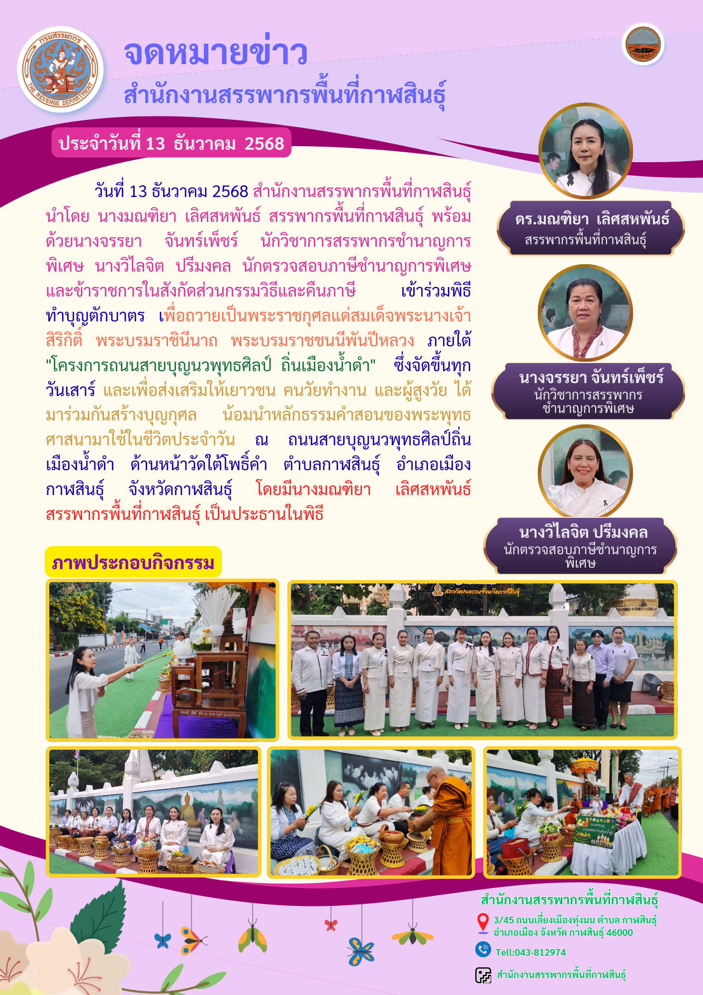 วันพฤหัสบดี ที่ 11 กันยายน 2568 เวลา 06.30 น. นางมณฑิยา เลิศสหพันธ์ สรรพากรพื้นที่กาฬสินธุ์ ได้เข้าร่วมเป็นเกียรติและร่วมทำบุญตักบาตร ในพิธีเปิดโครงการถนนสายบุญนวพุ...
