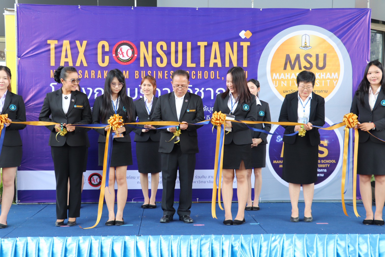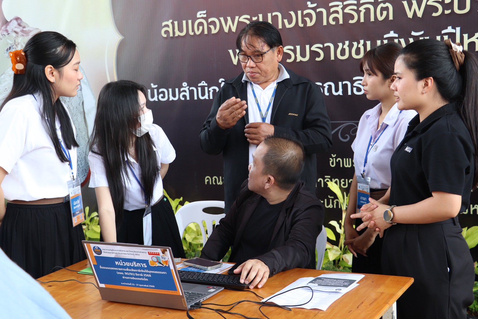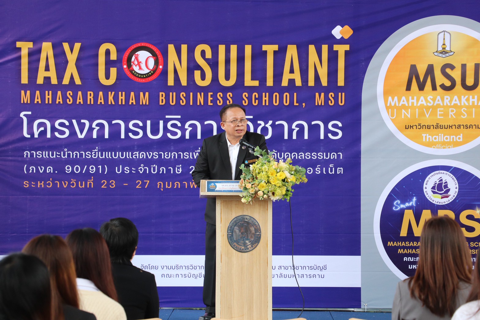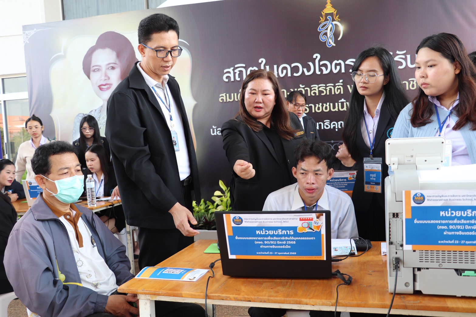 วันที่ 23 กุมภาพันธ์ 2569 นางสาววิลาวัณย์ เอกประเสริฐกุล สรรพากรพื้นที่มหาสารคาม มอบหมายให้ นางสาวภัทรวิดี เจริญสุข นักวิชาการสรรพากรชำนาญการพิเศษ พร้อมด้วย นายธนัญชัย ใจทน นักวิชาการสรรพากรชำนาญการพิเศษ และบุคลากรสำนักงานสรรพากรพื้นที่มหาสารคาม เข้าร่วม”พิธีเปิดโครงการบริการวิชาการแนะนำการยื่นแบบแสดงรายการเพื่อชำระภาษีเงินได้บุคคลธรรมดา (ภงด. 90/91) ประจำปีภาษี 2568 ผ่านทางอินเทอร์เน็ต” และออกบูธแนะนำประชาสัมพันธ์การให้บริการทางอิเล็กทรอนิกส์ การยื่นแบบแสดงรายการภาษีเงินได้บุคคลธรรมดา E-FILING , e-Donation, D-Mytax รวบรวมบริการทางภาษี (One Portal), E-SERVICE ของกรมสรรพากร ณ หน่วยบริการลานชั้น 1 อาคารบรมราชกุมารี มหาวิทยาลัยมหาสารคาม ตำบลขามเรียง อำเภอกันทรวิชัย จังหวัดมหาสารคาม โดยมี รองศาสตรจารย์ ดร.จรวย สาวิถี คณบดีคณะการบัญชีและการจัดการ มหาวิทยาลัยมหาสารคาม เป็นประธาน