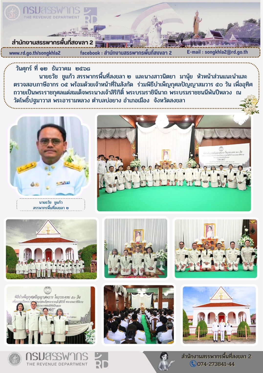สำนักงานสรรพากรพื้นที่สงขลา 2 ร่วมพิธีบำเพ็ญกุศลปัญญาสมวาร 50 วัน เพื่ออุทิศถวายเป็นพระราชกุศลแด่สมเด็จพระนางเจ้าสิริกิติ์ พระบรมราชินีนาถ พระบรมราชชนนีพันปีหลวง ณ วัดโพธิ์ปฐมาวาส พระอารามหลวง ต.บ่อยาง อ.เมือง จ.สงขลา